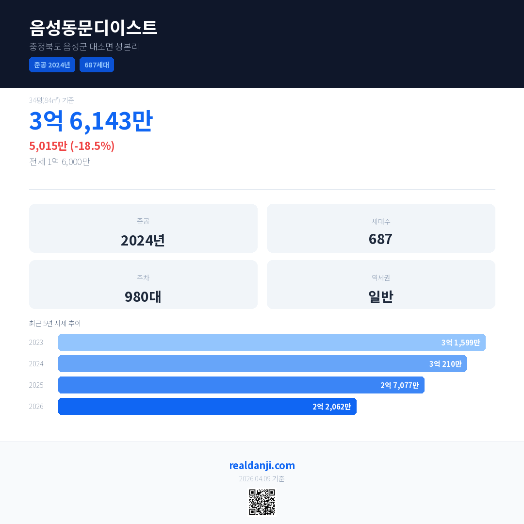 음성동문디이스트 최근 거래가는 2억 7,000만입니다. (2026-02)