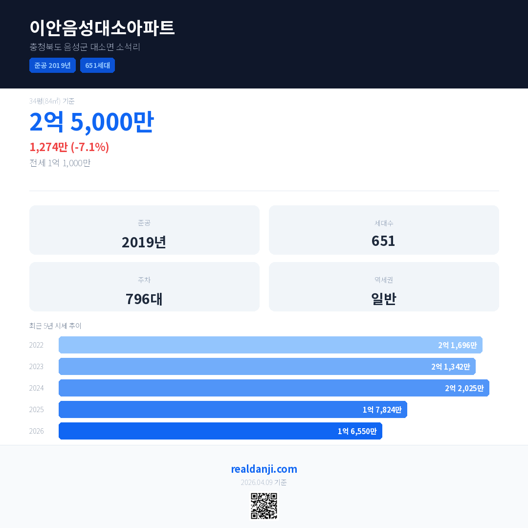 이안음성대소아파트 최근 거래가는 2억 5,000만입니다. (2026-04)