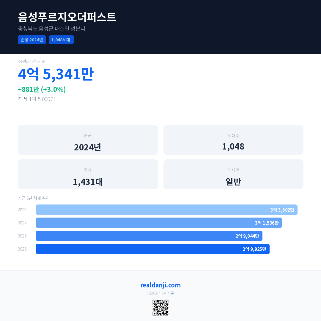 음성푸르지오더퍼스트 최근 거래가는 4억 5,341만입니다. (2026-03)