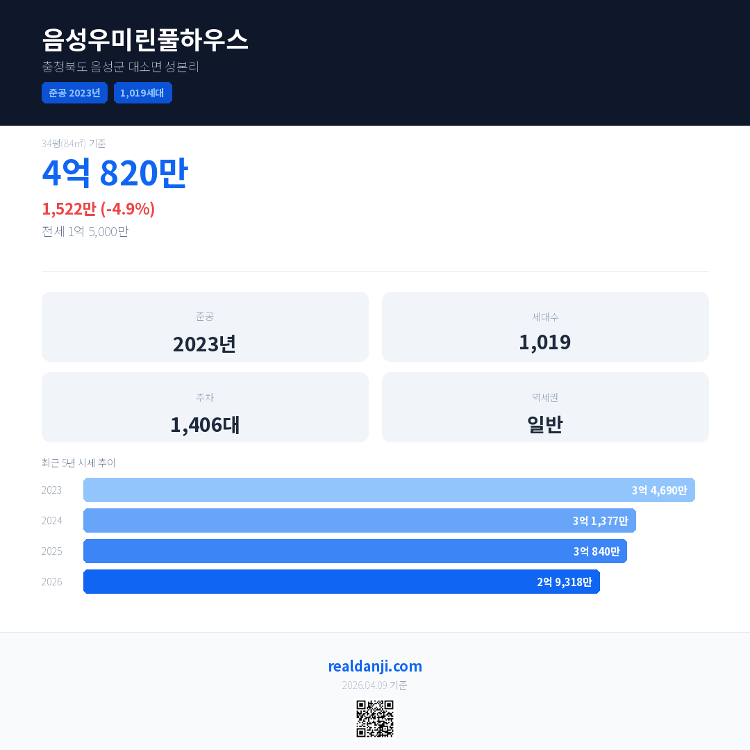 음성우미린풀하우스 최근 거래가는 2억 6,590만입니다. (2026-03)