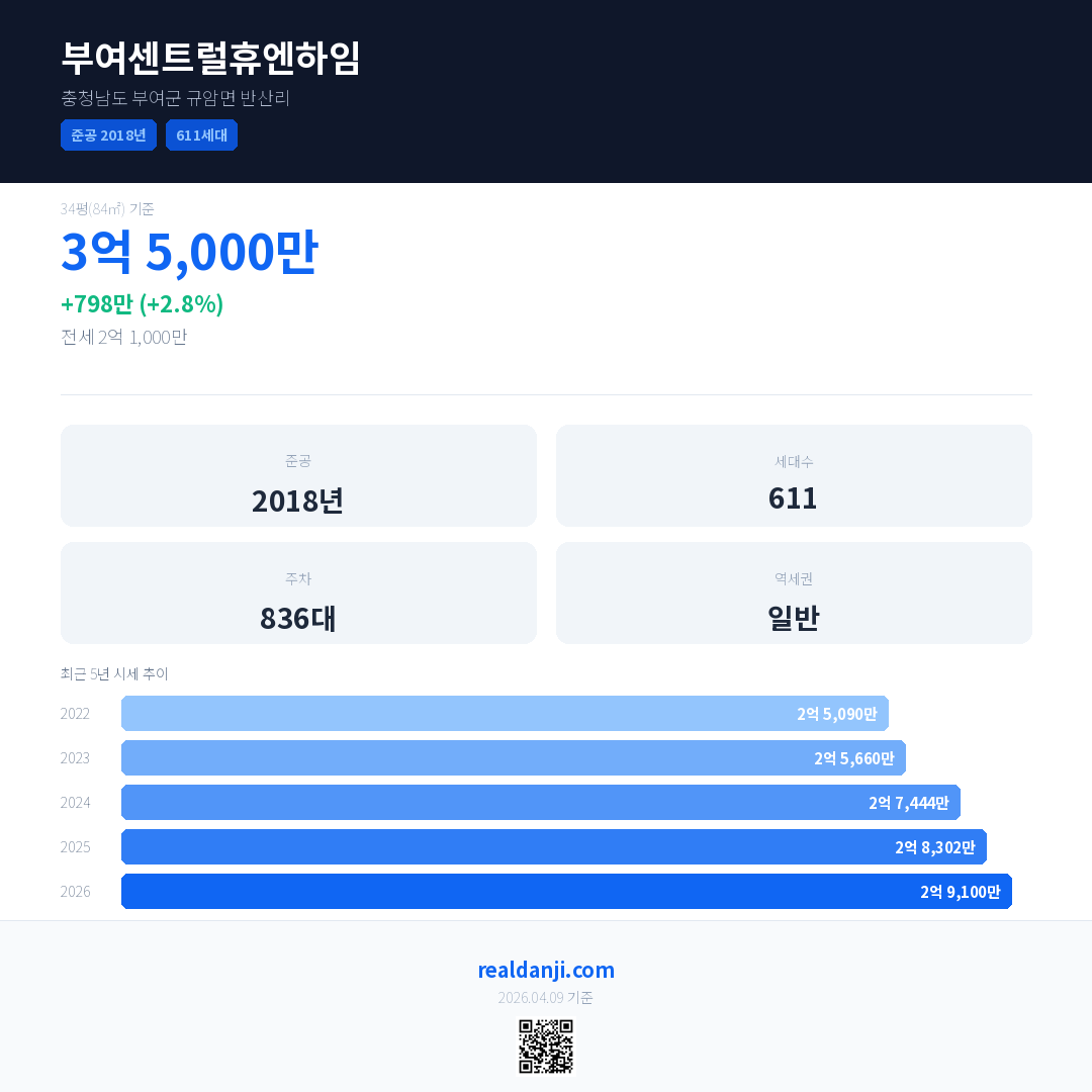 부여센트럴휴엔하임은(는) 2018년에 준공되었으며, 현재 8년차입니다. 총 611세대 규모입니다.