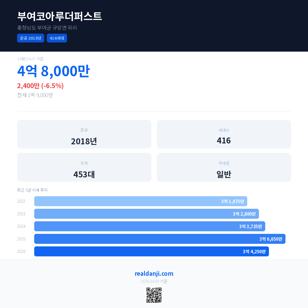 부여코아루더퍼스트 최근 거래가는 3억 4,500만입니다. (2026-03)