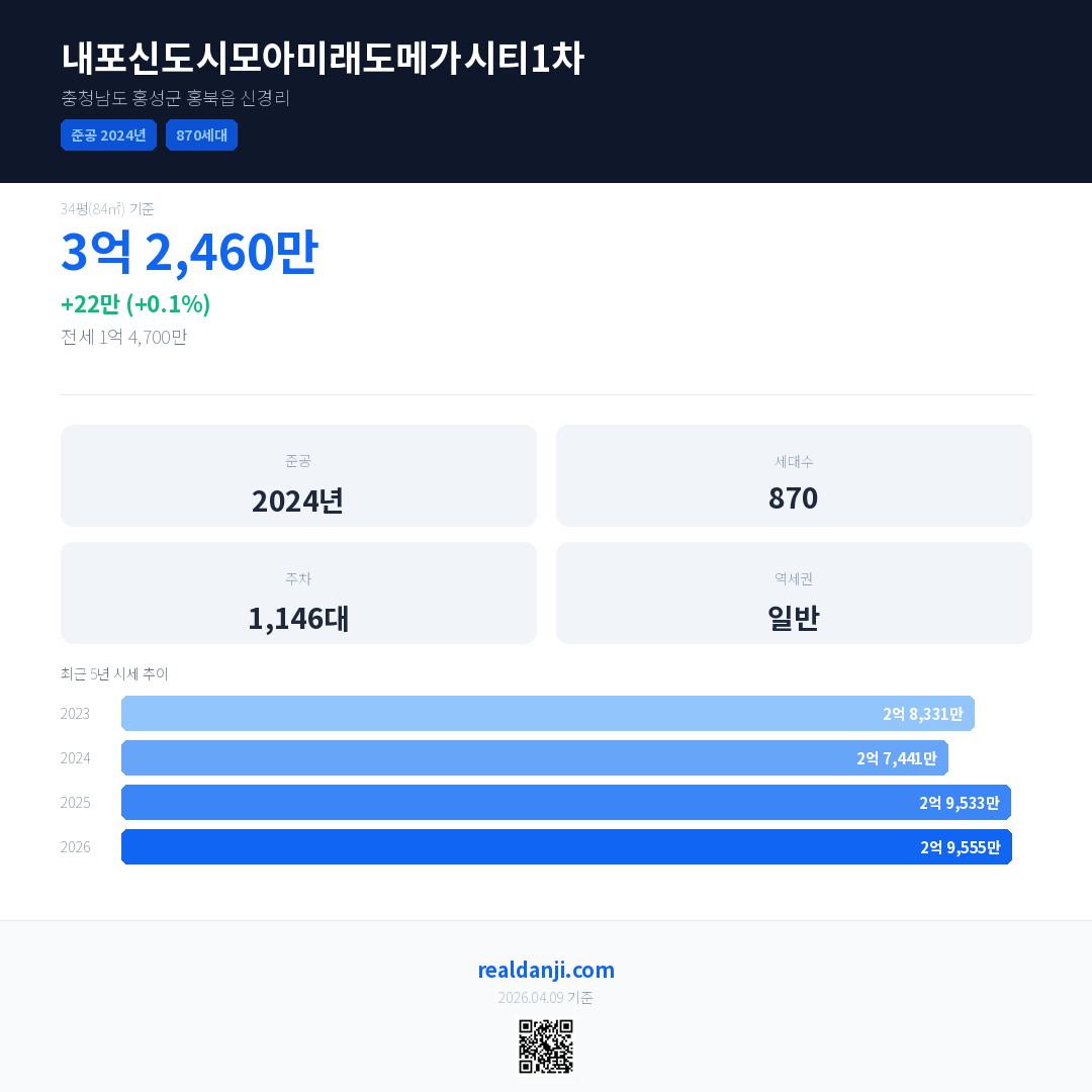 내포신도시모아미래도메가시티1차은(는) 2024년에 준공되었으며, 현재 2년차입니다. 총 870세대 규모입니다.