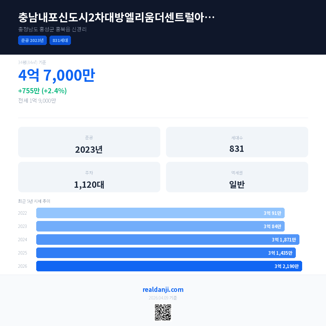 충남내포신도시2차대방엘리움더센트럴아파트은(는) 2023년에 준공되었으며, 현재 3년차입니다. 총 831세대 규모입니다.