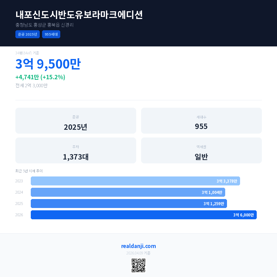 내포신도시반도유보라마크에디션 국민평형 기준 2026년 평균 거래가는 3억 6,000만으로, 전년 대비 15.2% 상승 했습니다.