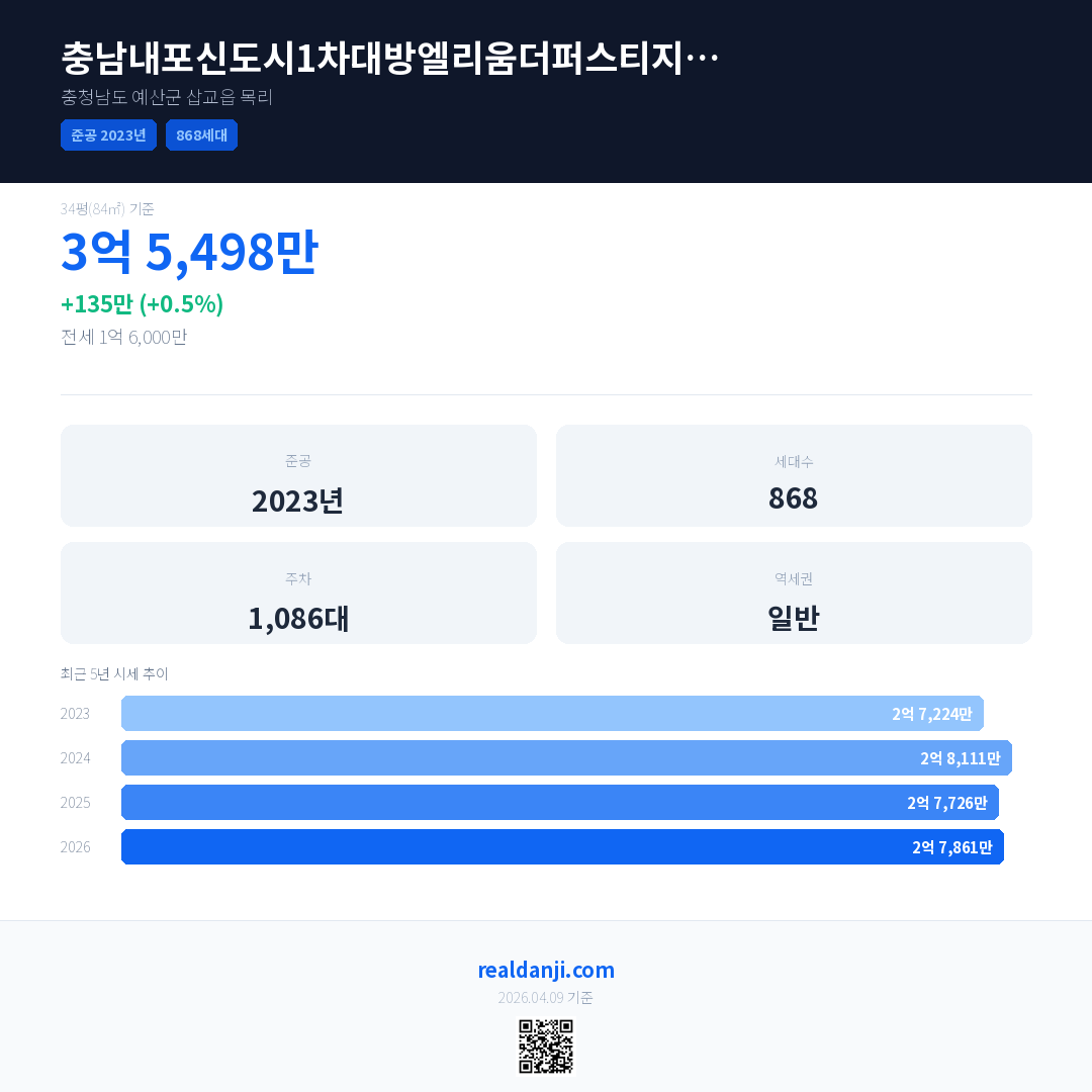 충남내포신도시1차대방엘리움더퍼스티지아파트 국민평형 기준 2026년 평균 거래가는 2억 7,861만으로, 전년 대비 0.5% 상승 했습니다.