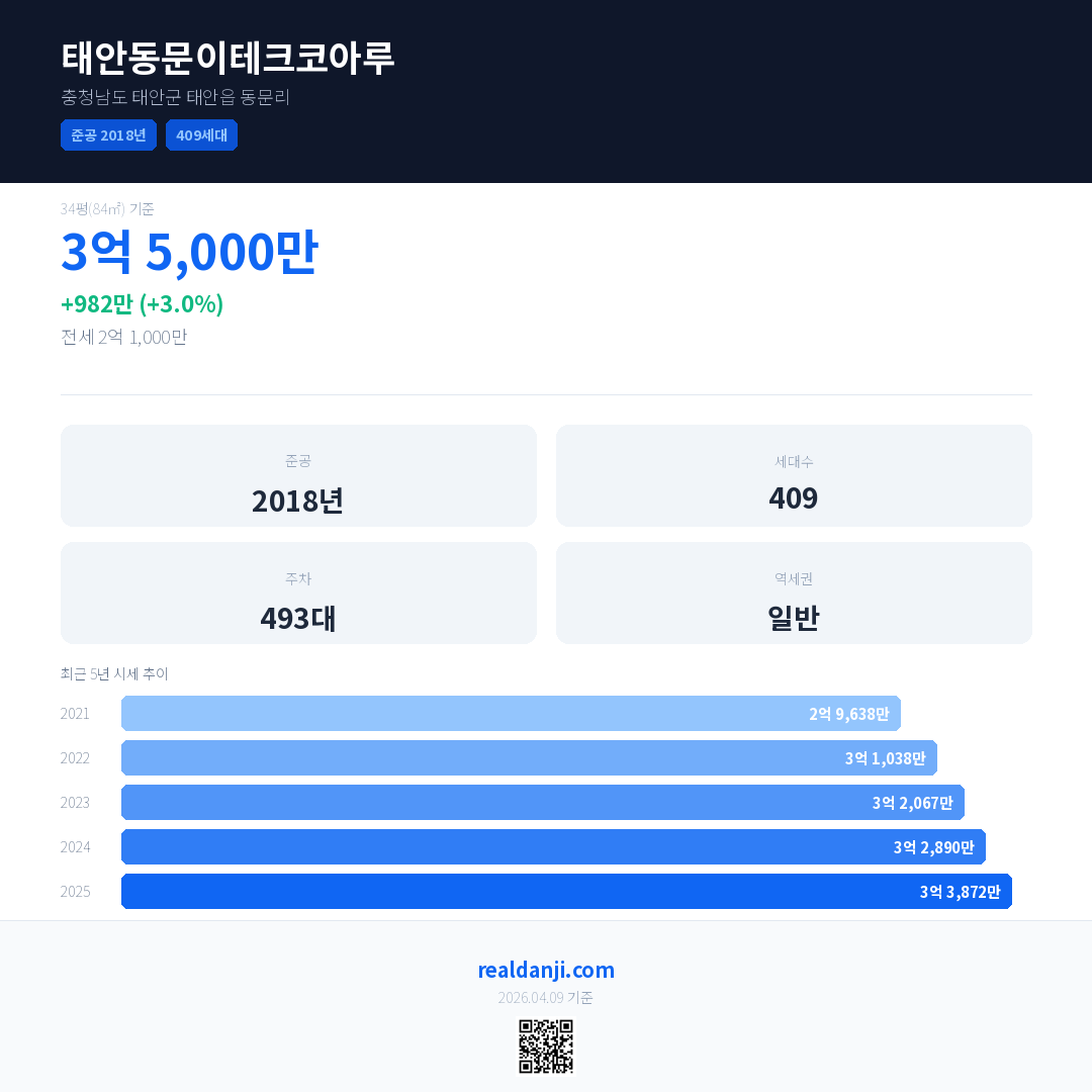 태안동문이테크코아루 최근 거래가는 3억 5,000만입니다. (2025-12)