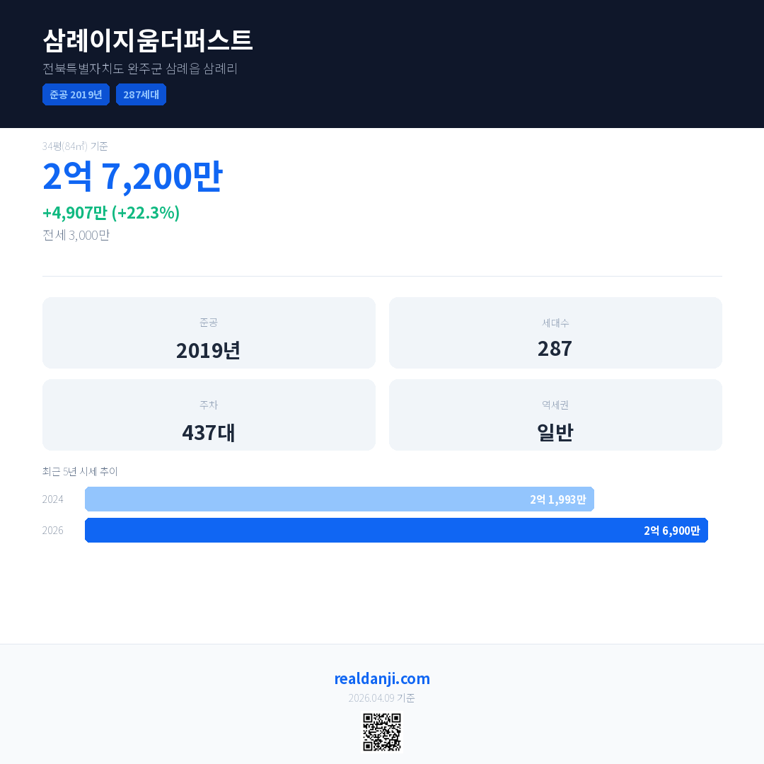 삼례이지움더퍼스트 국민평형 기준 2026년 평균 거래가는 2억 6,900만으로, 전년 대비 22.3% 상승 했습니다.