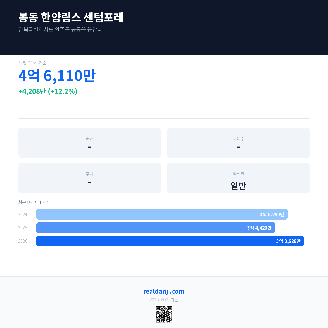 봉동 한양립스 센텀포레 최근 거래가는 4억 6,110만입니다. (2026-03)