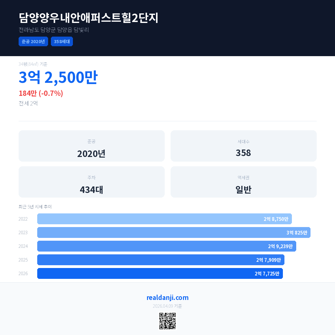 담양양우내안애퍼스트힐2단지 국민평형 기준 2026년 평균 거래가는 2억 7,725만으로, 전년 대비 0.7% 하락 했습니다.