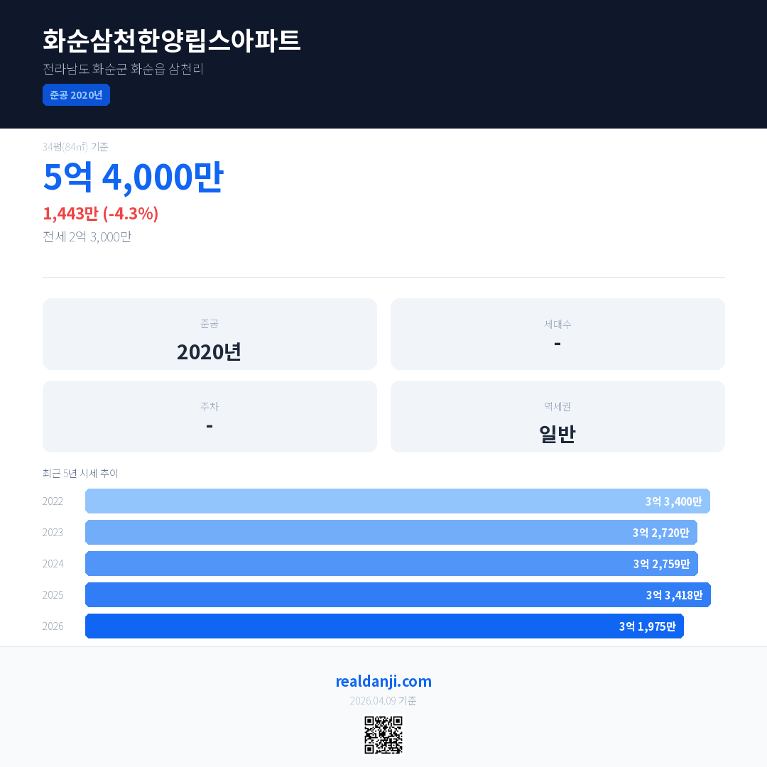 화순삼천한양립스아파트 최근 거래가는 5억 4,000만입니다. (2026-03)