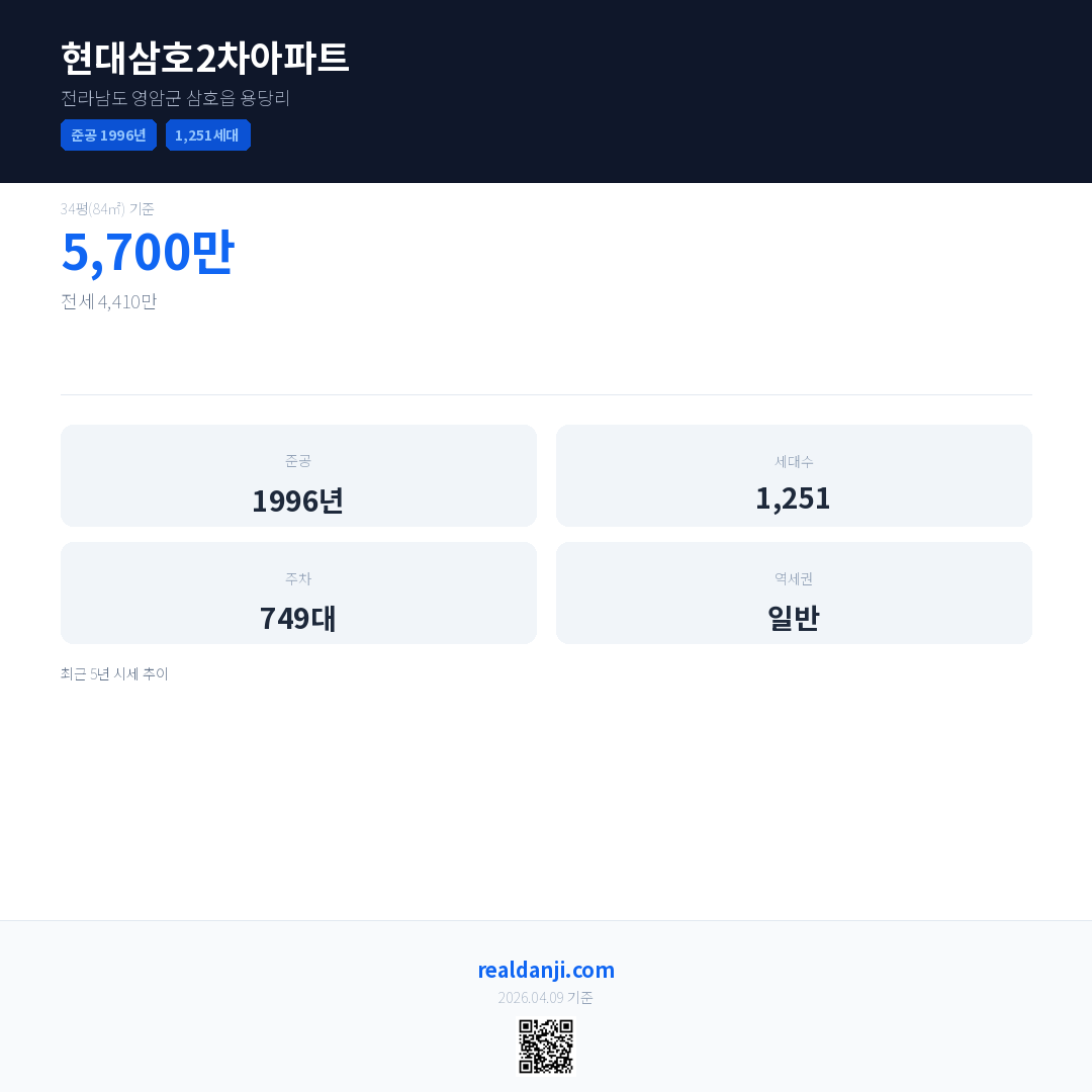 현대삼호2차아파트은(는) 1996년에 준공되었으며, 현재 30년차입니다. 총 1,251세대 규모입니다.