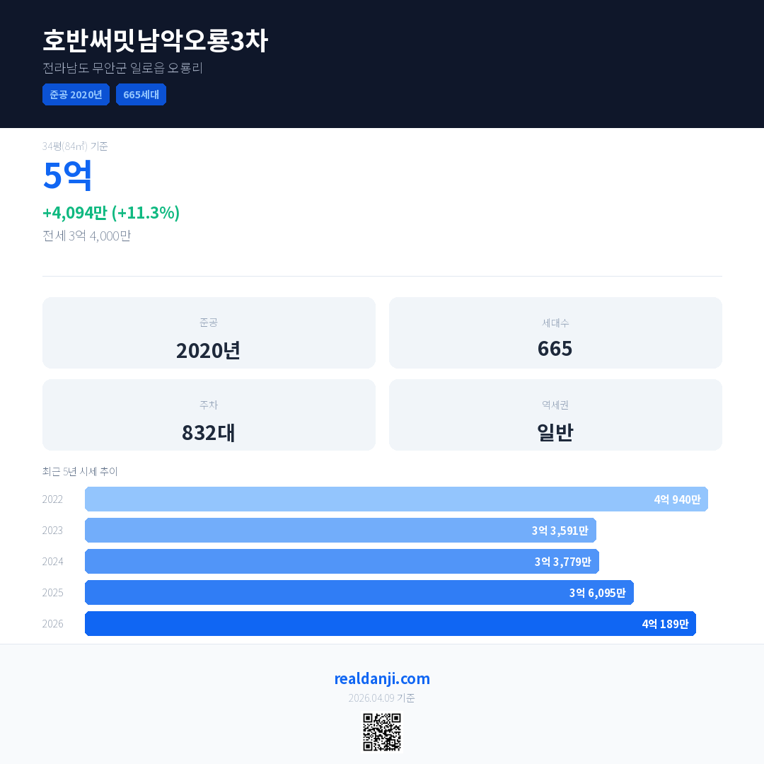 호반써밋남악오룡3차 국민평형 기준 2026년 평균 거래가는 4억 189만으로, 전년 대비 11.3% 상승 했습니다.