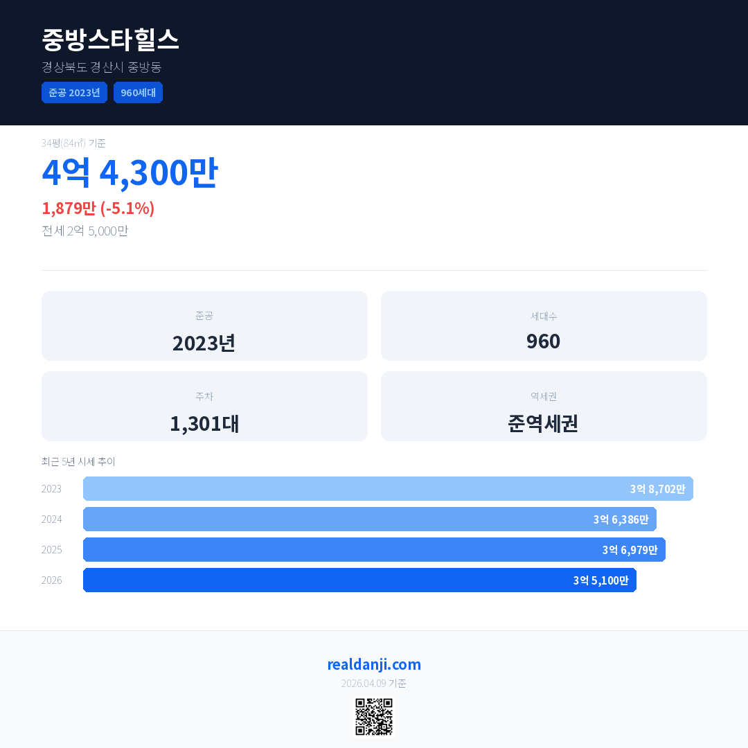 중방스타힐스 최근 거래가는 4억 4,300만입니다. (2026-03)