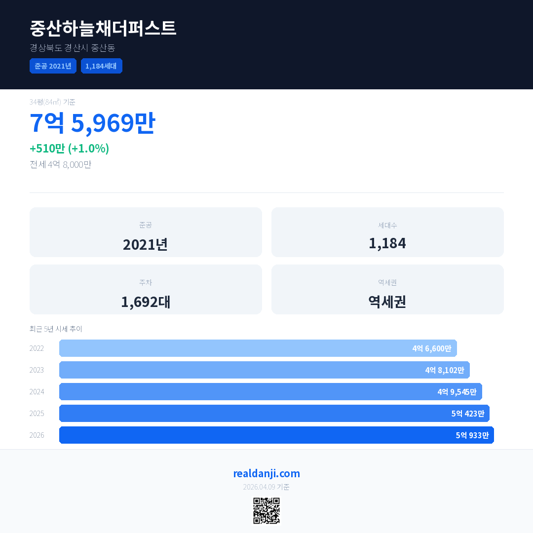 중산하늘채더퍼스트 최근 거래가는 7억 5,969만입니다. (2026-04)
