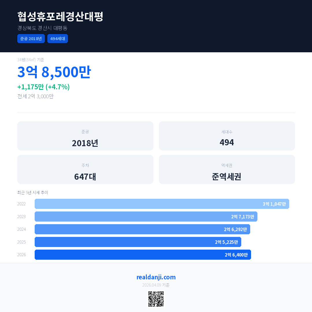 협성휴포레경산대평 국민평형 기준 2026년 평균 거래가는 2억 6,400만으로, 전년 대비 4.7% 상승 했습니다.
