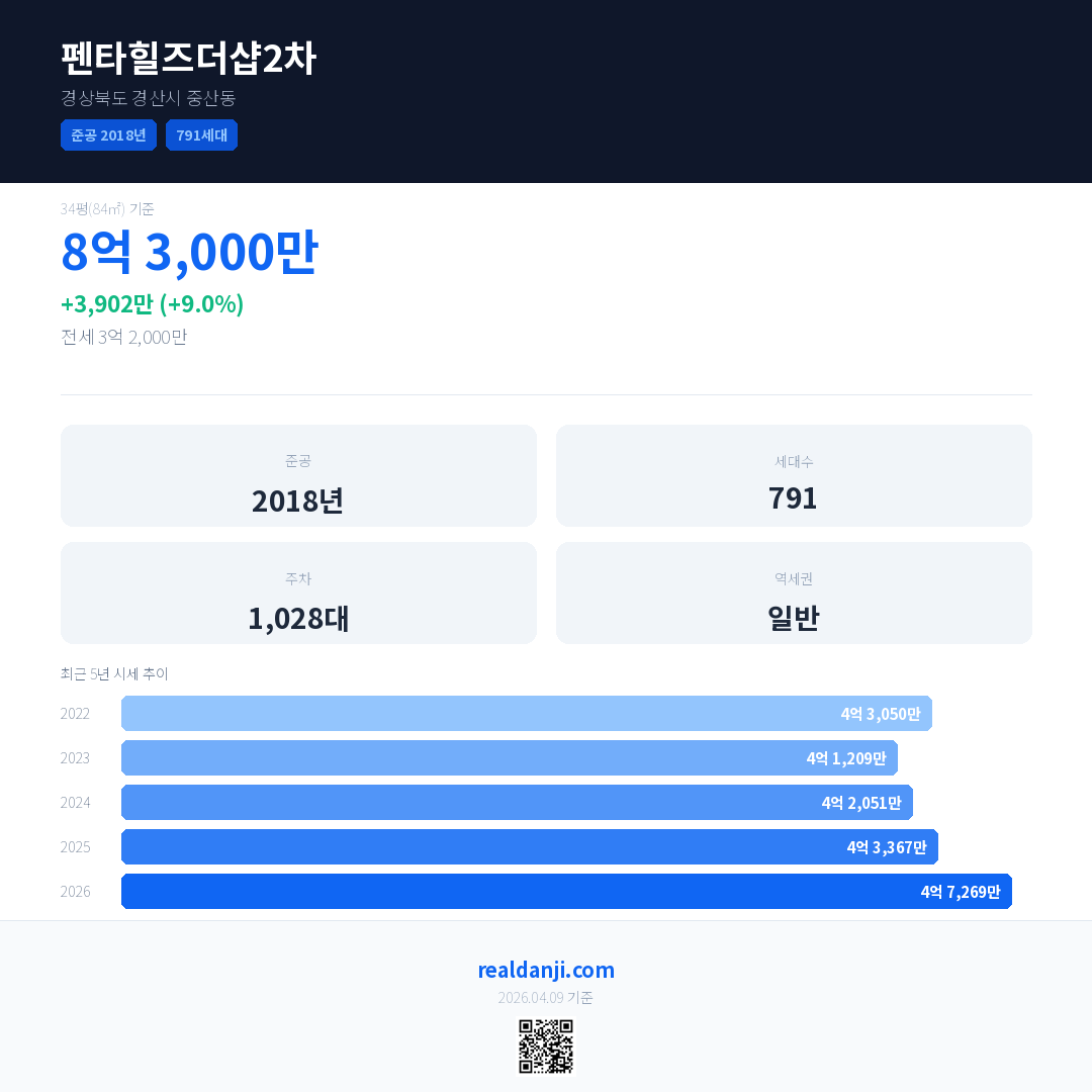 펜타힐즈더샵2차 최근 거래가는 8억 3,000만입니다. (2026-03)