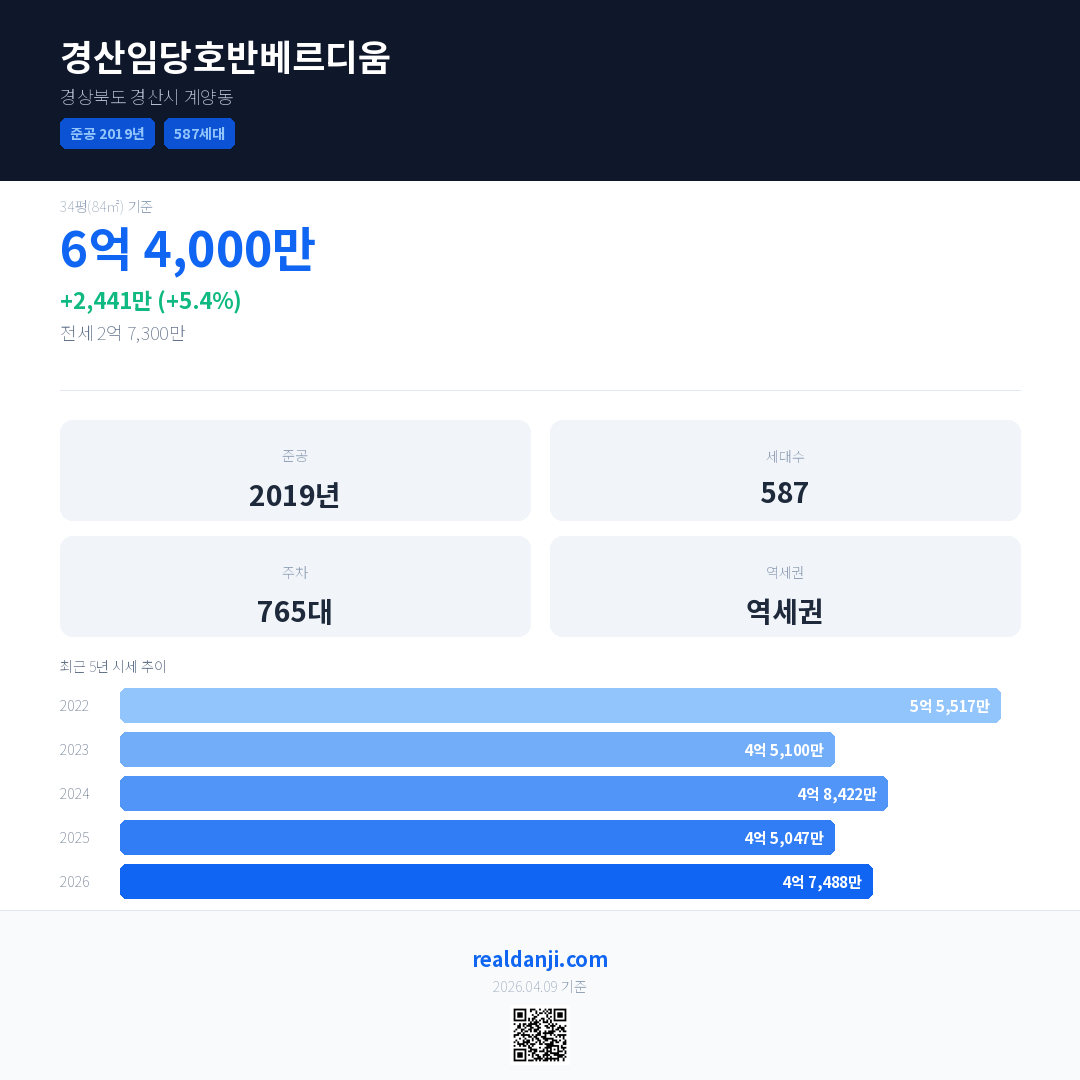 경산임당호반베르디움 국민평형 기준 2026년 평균 거래가는 4억 7,488만으로, 전년 대비 5.4% 상승 했습니다.