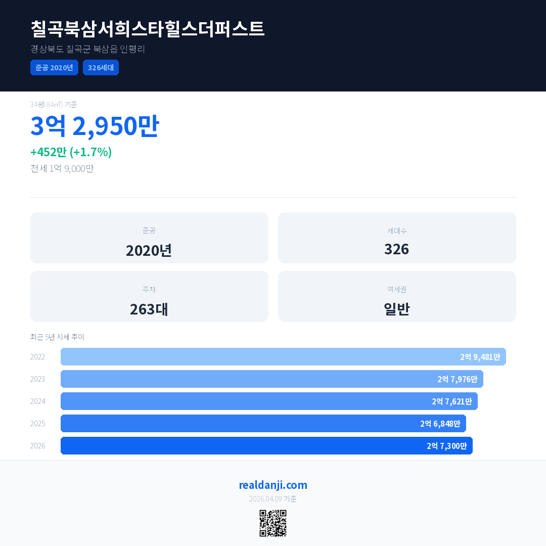 칠곡북삼서희스타힐스더퍼스트 국민평형 기준 2026년 평균 거래가는 2억 7,300만으로, 전년 대비 1.7% 상승 했습니다.