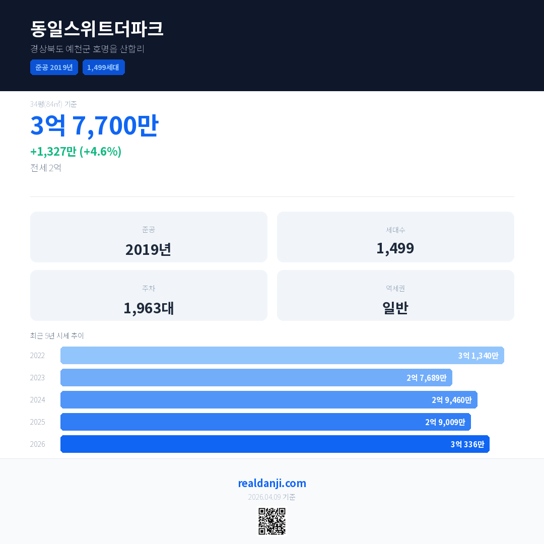 동일스위트더파크 국민평형 기준 2026년 평균 거래가는 3억 336만으로, 전년 대비 4.6% 상승 했습니다.
