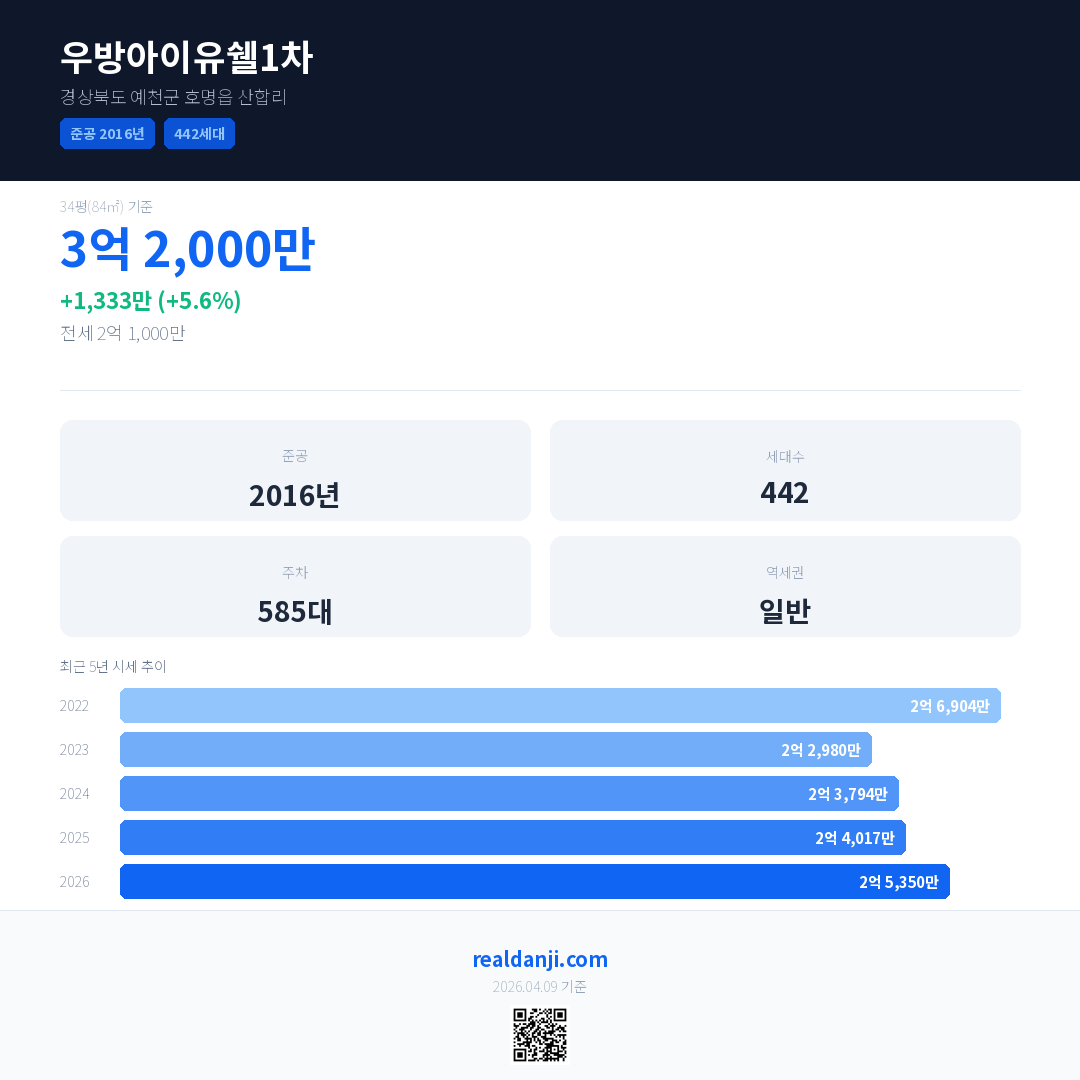 우방아이유쉘1차 국민평형 기준 2026년 평균 거래가는 2억 5,350만으로, 전년 대비 5.6% 상승 했습니다.
