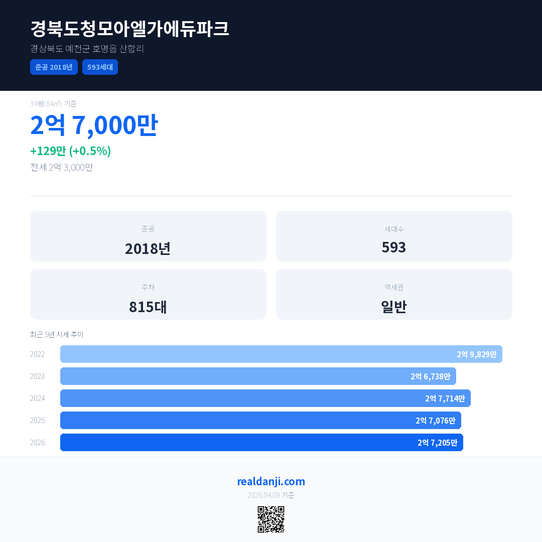 경북도청모아엘가에듀파크 국민평형 기준 2026년 평균 거래가는 2억 7,205만으로, 전년 대비 0.5% 상승 했습니다.