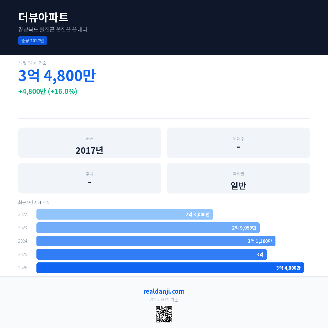 더뷰아파트 국민평형 기준 2026년 평균 거래가는 3억 4,800만으로, 전년 대비 16.0% 상승 했습니다.