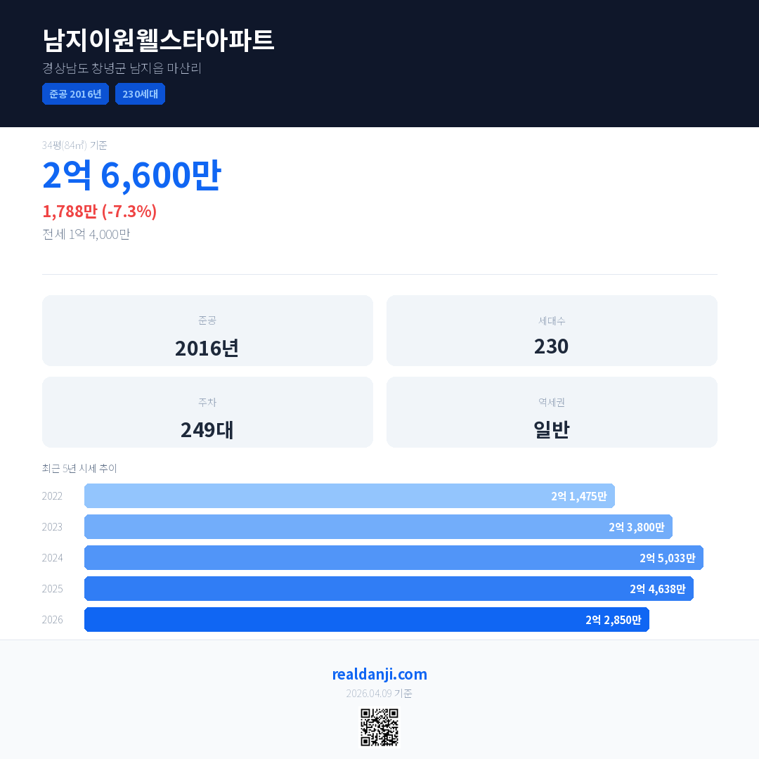 남지이원웰스타아파트 국민평형 기준 2026년 평균 거래가는 2억 2,850만으로, 전년 대비 7.3% 하락 했습니다.