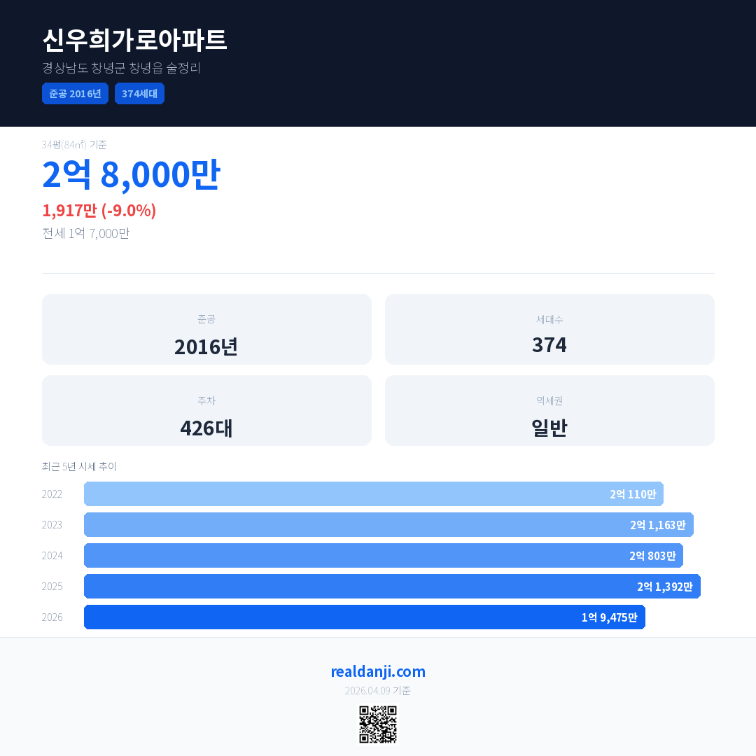 신우희가로아파트 최근 거래가는 2억 8,000만입니다. (2026-02)
