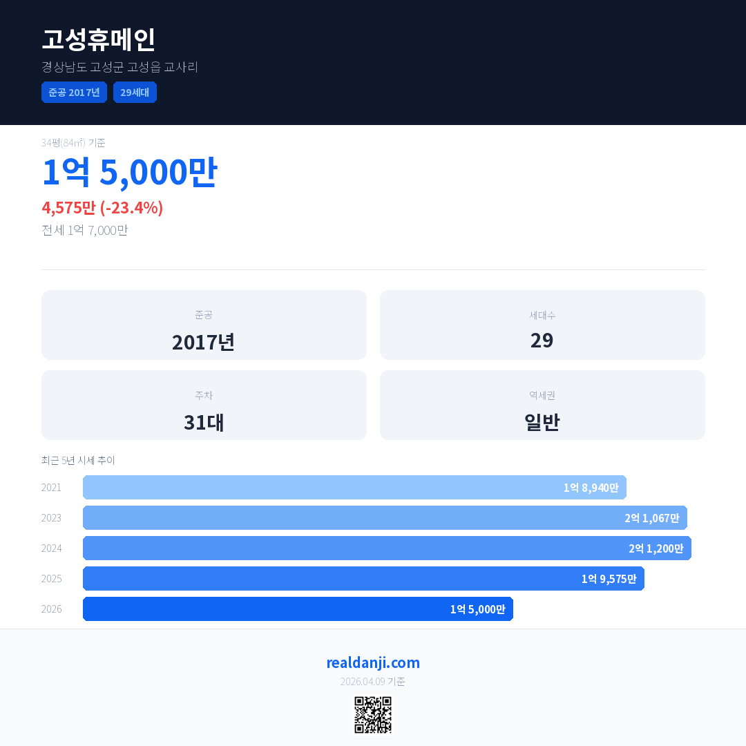 고성휴메인 국민평형 기준 2026년 평균 거래가는 1억 5,000만으로, 전년 대비 23.4% 하락 했습니다.