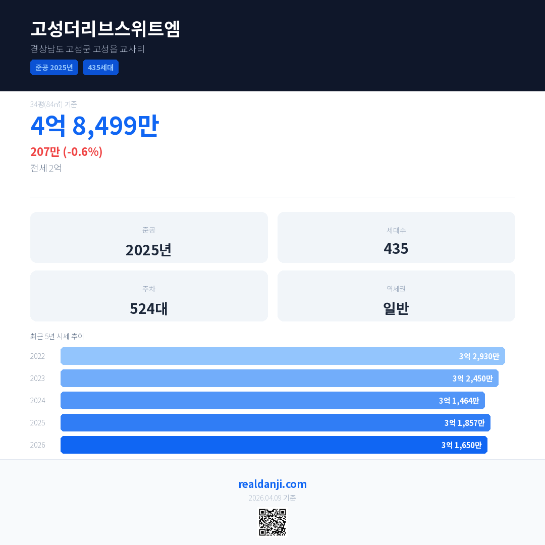고성더리브스위트엠 최근 거래가는 4억 4,589만입니다. (2026-03)