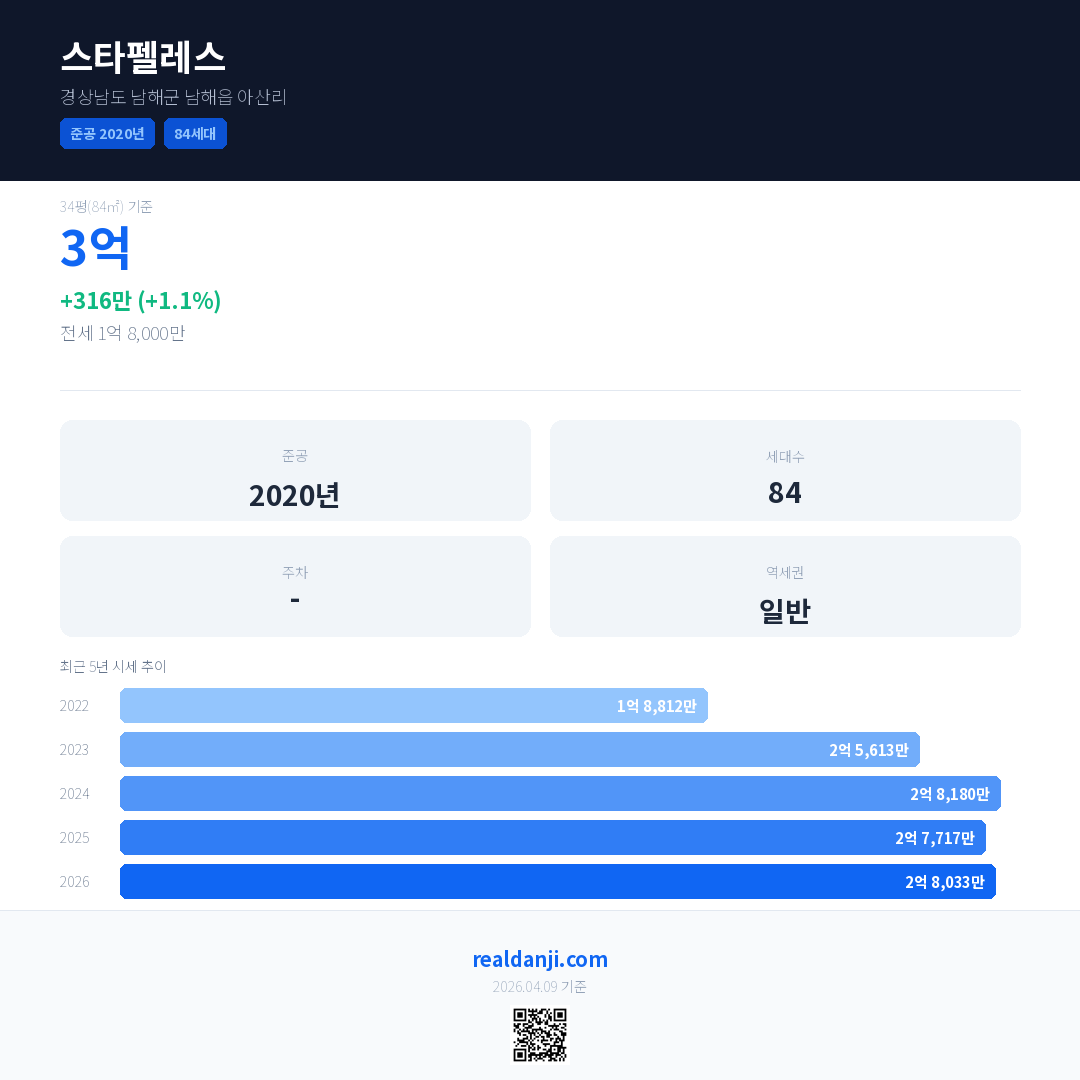 스타펠레스 국민평형 기준 2026년 평균 거래가는 2억 8,033만으로, 전년 대비 1.1% 상승 했습니다.