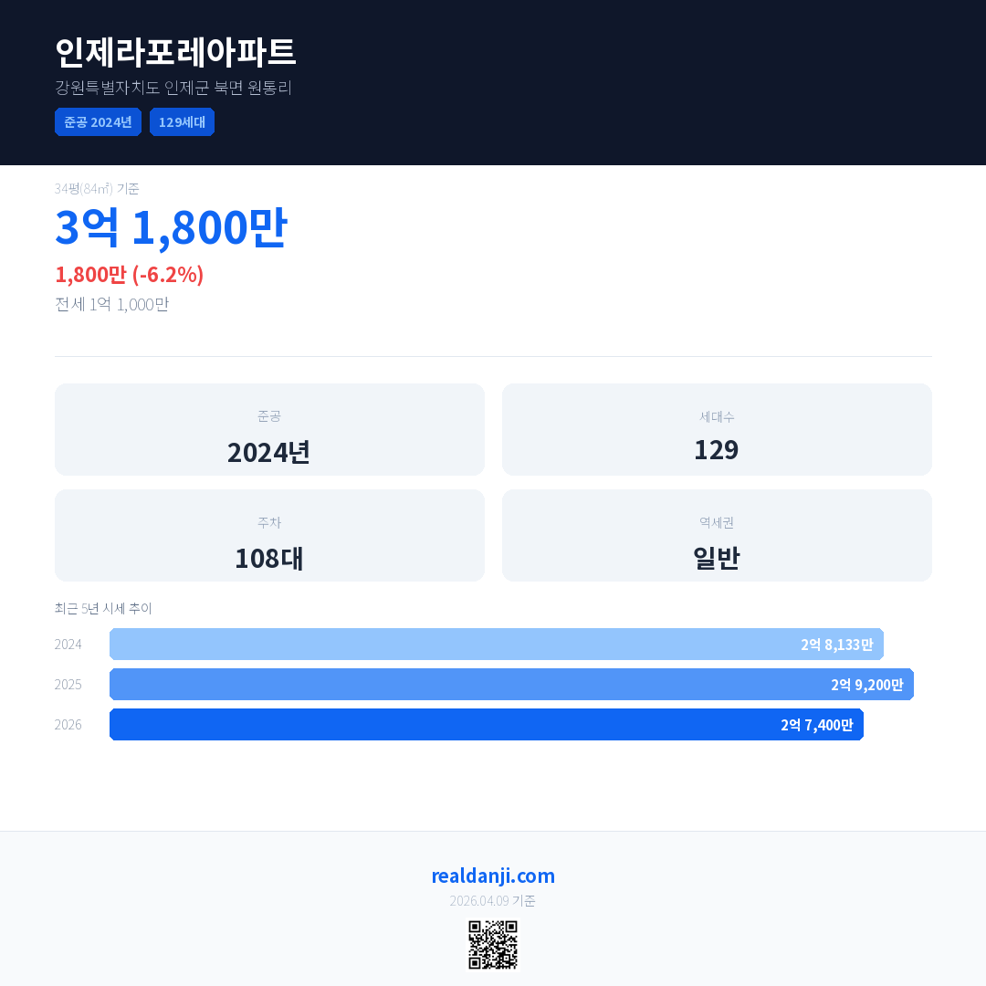 인제라포레아파트은(는) 2024년에 준공되었으며, 현재 2년차입니다. 총 129세대 규모입니다.