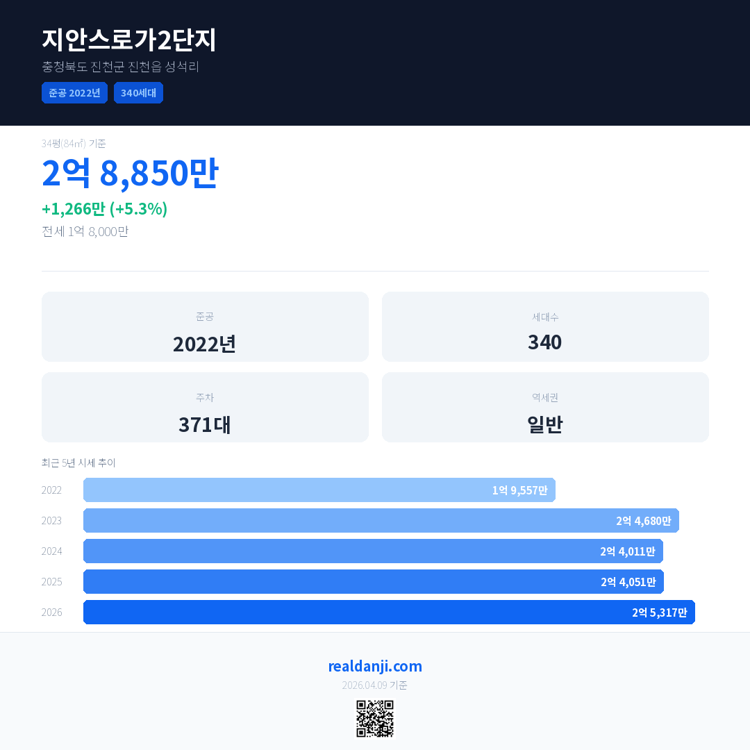 지안스로가2단지 국민평형 기준 2026년 평균 거래가는 2억 5,317만으로, 전년 대비 5.3% 상승 했습니다.