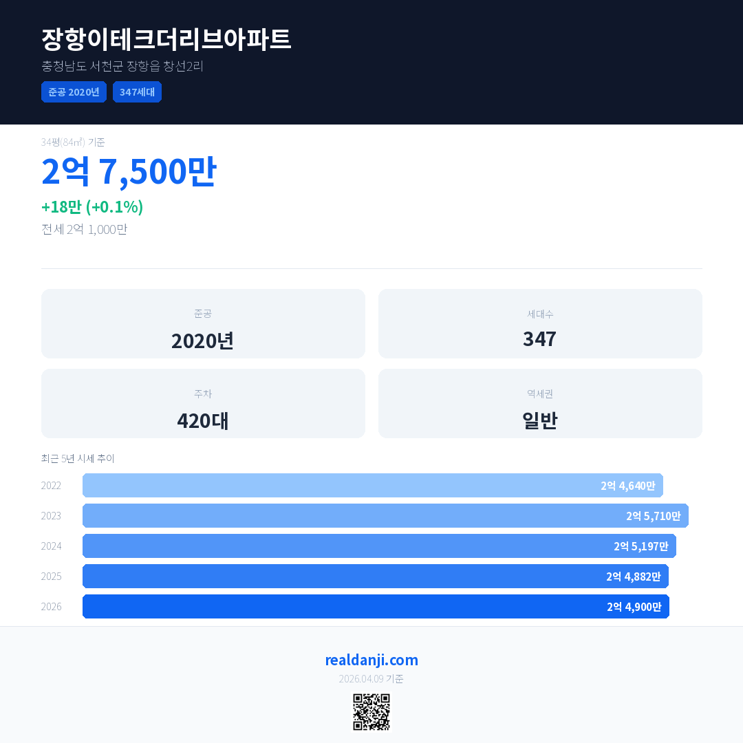 장항이테크더리브아파트 국민평형 기준 2026년 평균 거래가는 2억 4,900만으로, 전년 대비 0.1% 상승 했습니다.