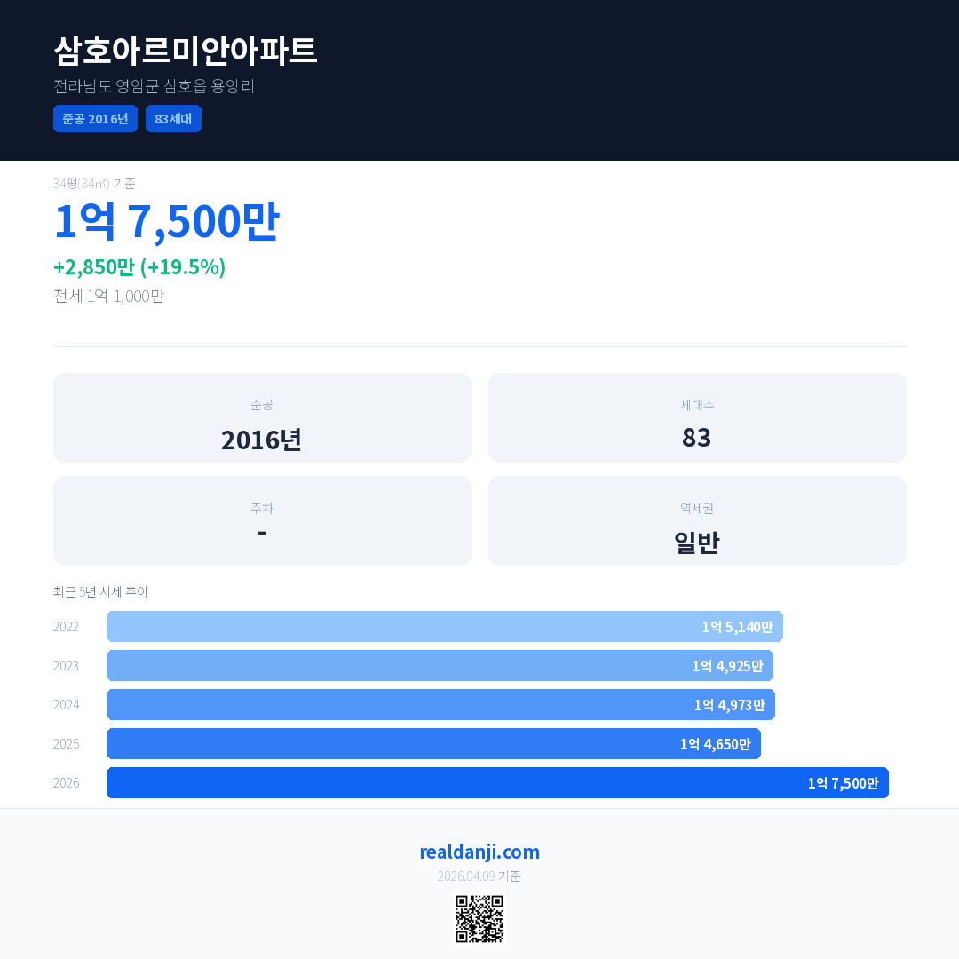 삼호아르미안아파트 국민평형 기준 2026년 평균 거래가는 1억 7,500만으로, 전년 대비 19.5% 상승 했습니다.