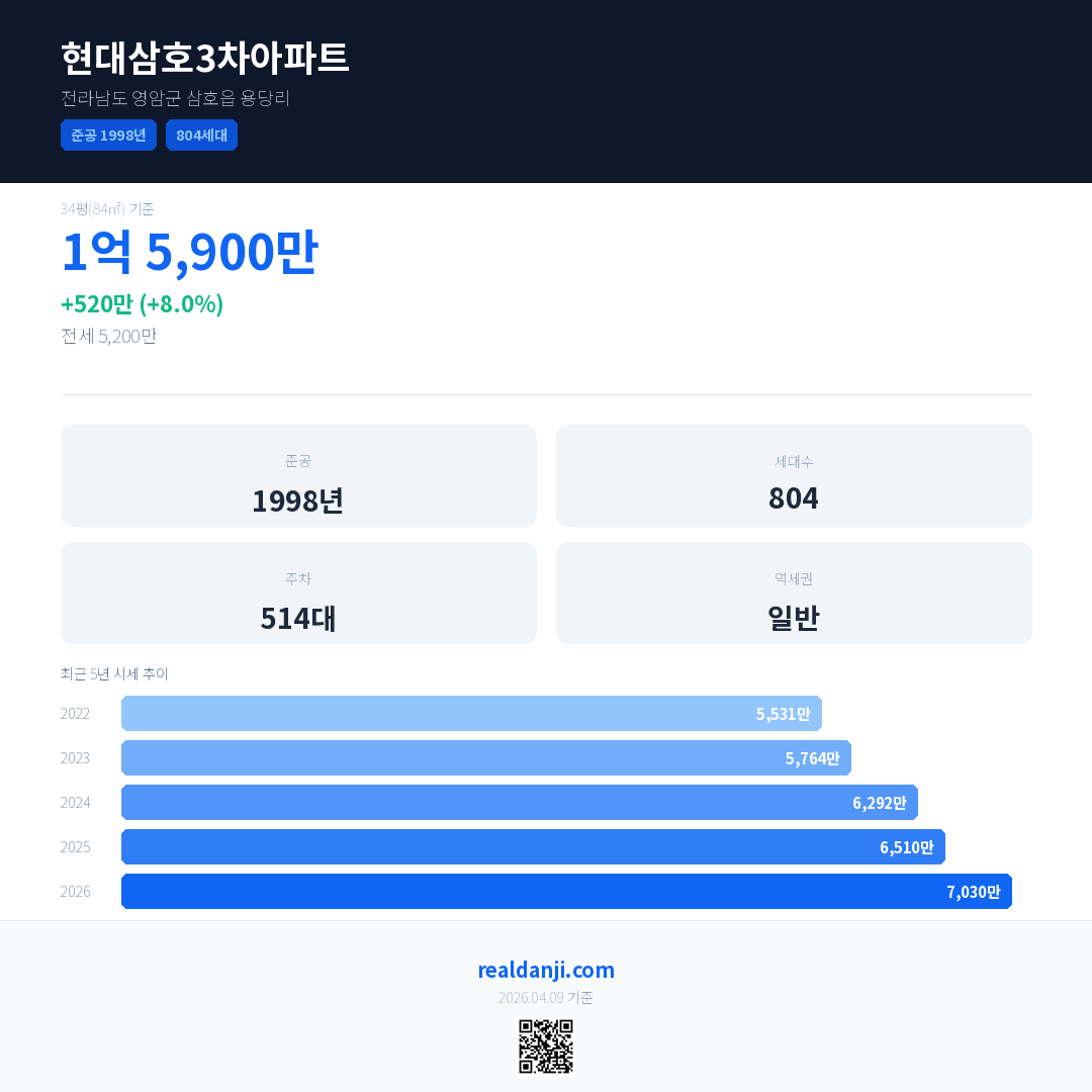 현대삼호3차아파트 국민평형 기준 2026년 평균 거래가는 7,030만으로, 전년 대비 8.0% 상승 했습니다.