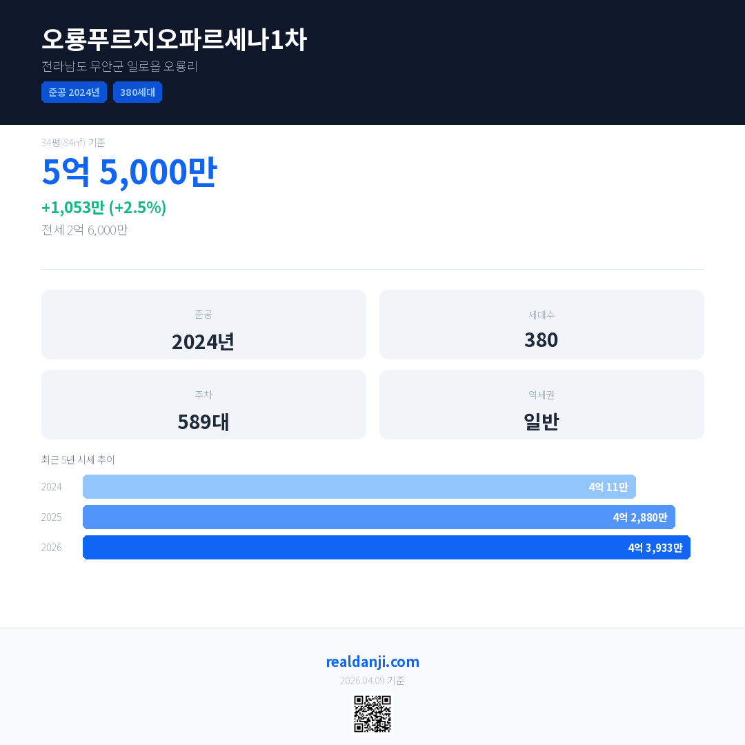 오룡푸르지오파르세나1차 최근 거래가는 5억 5,000만입니다. (2026-03)