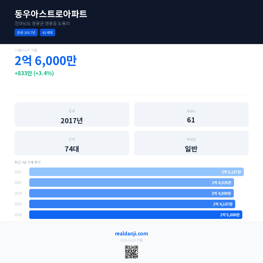 동우아스트로아파트 국민평형 기준 2026년 평균 거래가는 2억 5,000만으로, 전년 대비 3.4% 상승 했습니다.