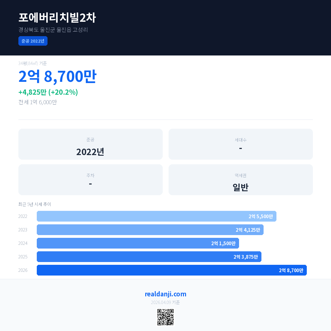 포에버리치빌2차 국민평형 기준 2026년 평균 거래가는 2억 8,700만으로, 전년 대비 20.2% 상승 했습니다.