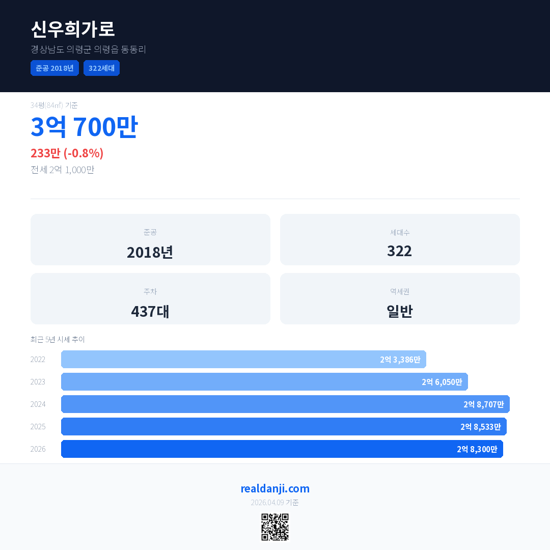 신우희가로 국민평형 기준 2026년 평균 거래가는 2억 8,300만으로, 전년 대비 0.8% 하락 했습니다.