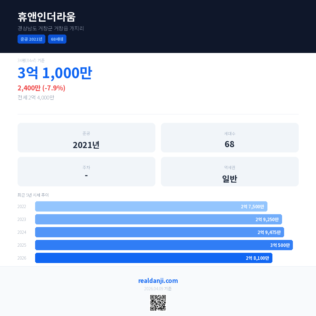 휴앤인더라움 국민평형 기준 2026년 평균 거래가는 2억 8,100만으로, 전년 대비 7.9% 하락 했습니다.