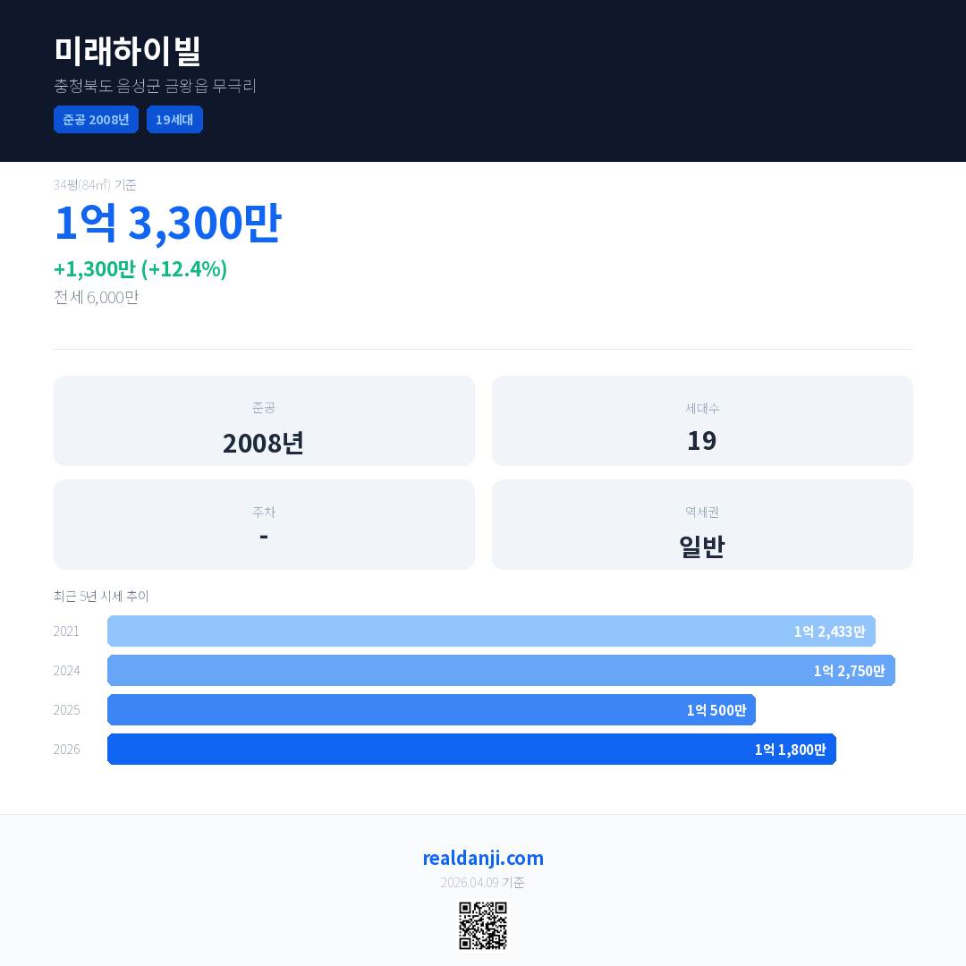 미래하이빌 최근 거래가는 1억 3,300만입니다. (2026-03)