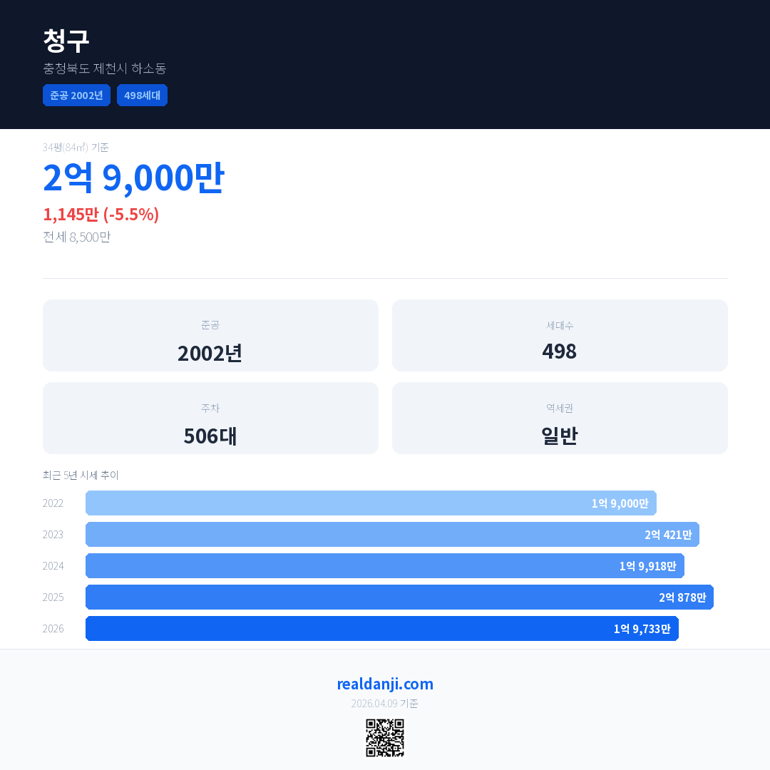 청구 국민평형 기준 2026년 평균 거래가는 1억 9,733만으로, 전년 대비 5.5% 하락 했습니다.