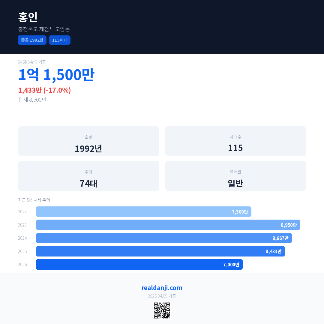 홍인 최근 거래가는 1억 1,500만입니다. (2026-01)