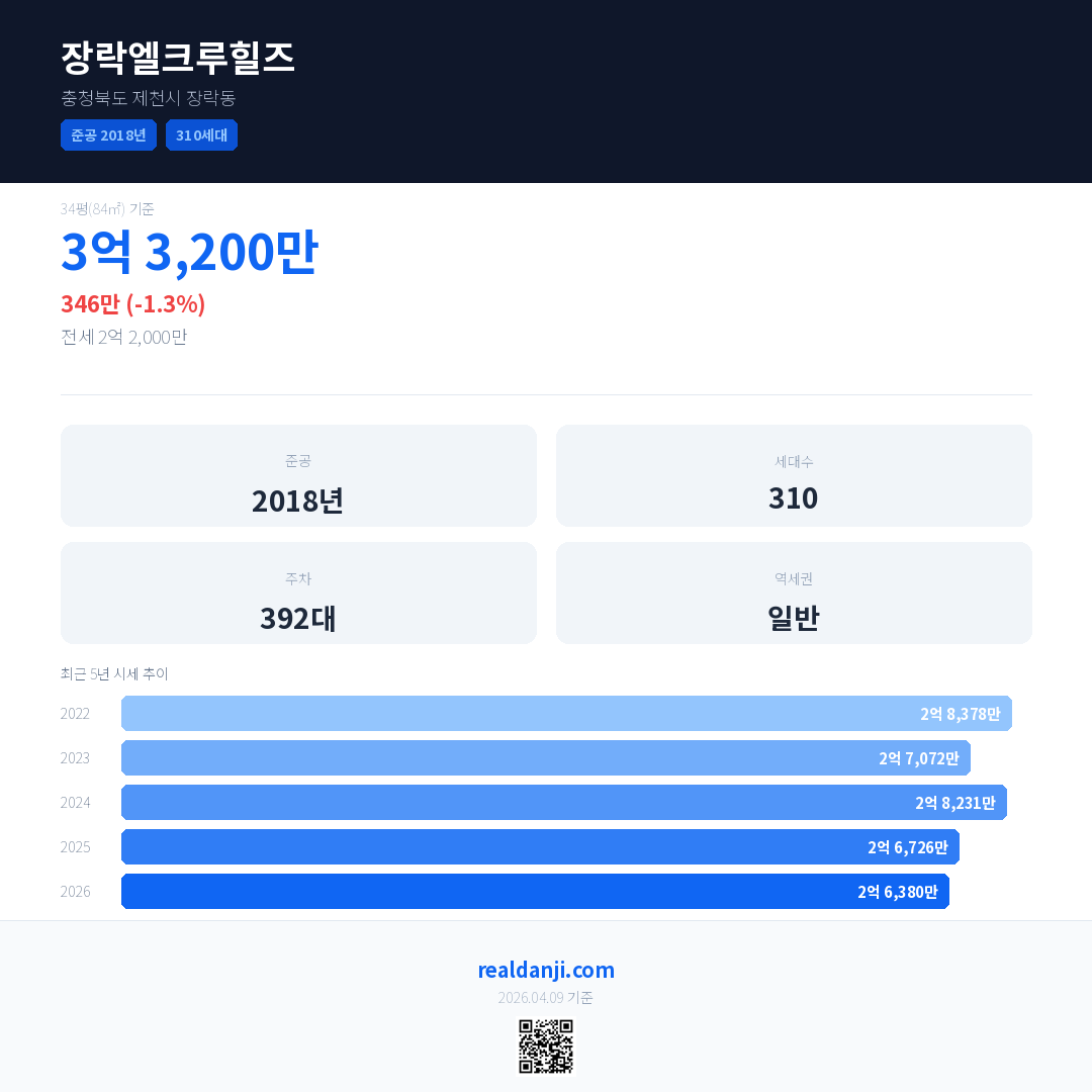 장락엘크루힐즈 국민평형 기준 2026년 평균 거래가는 2억 6,380만으로, 전년 대비 1.3% 하락 했습니다.