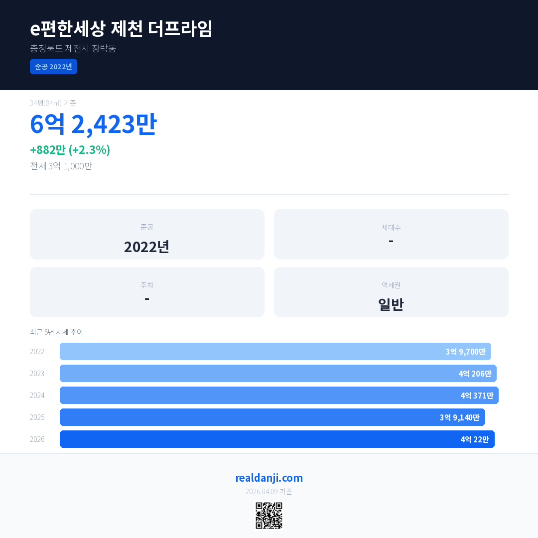 e편한세상 제천 더프라임 국민평형 기준 2026년 평균 거래가는 4억 22만으로, 전년 대비 2.3% 상승 했습니다.
