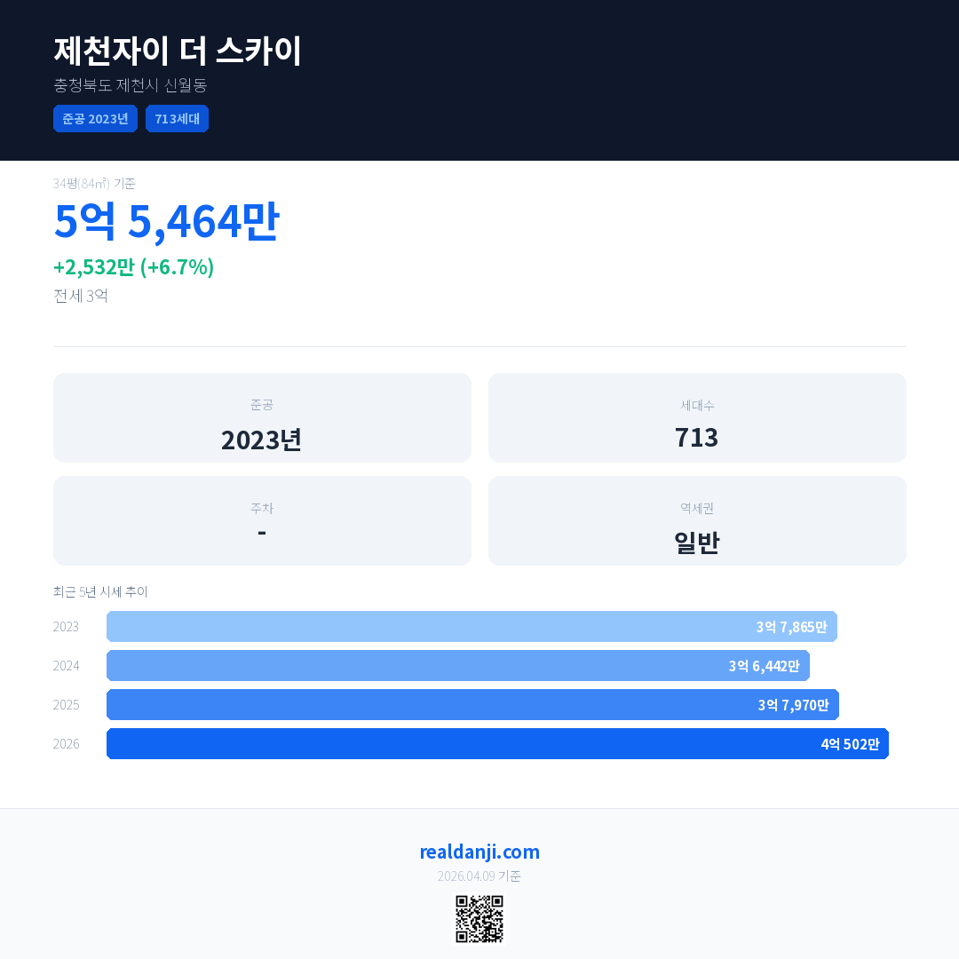 제천자이 더 스카이 국민평형 기준 2026년 평균 거래가는 4억 502만으로, 전년 대비 6.7% 상승 했습니다.