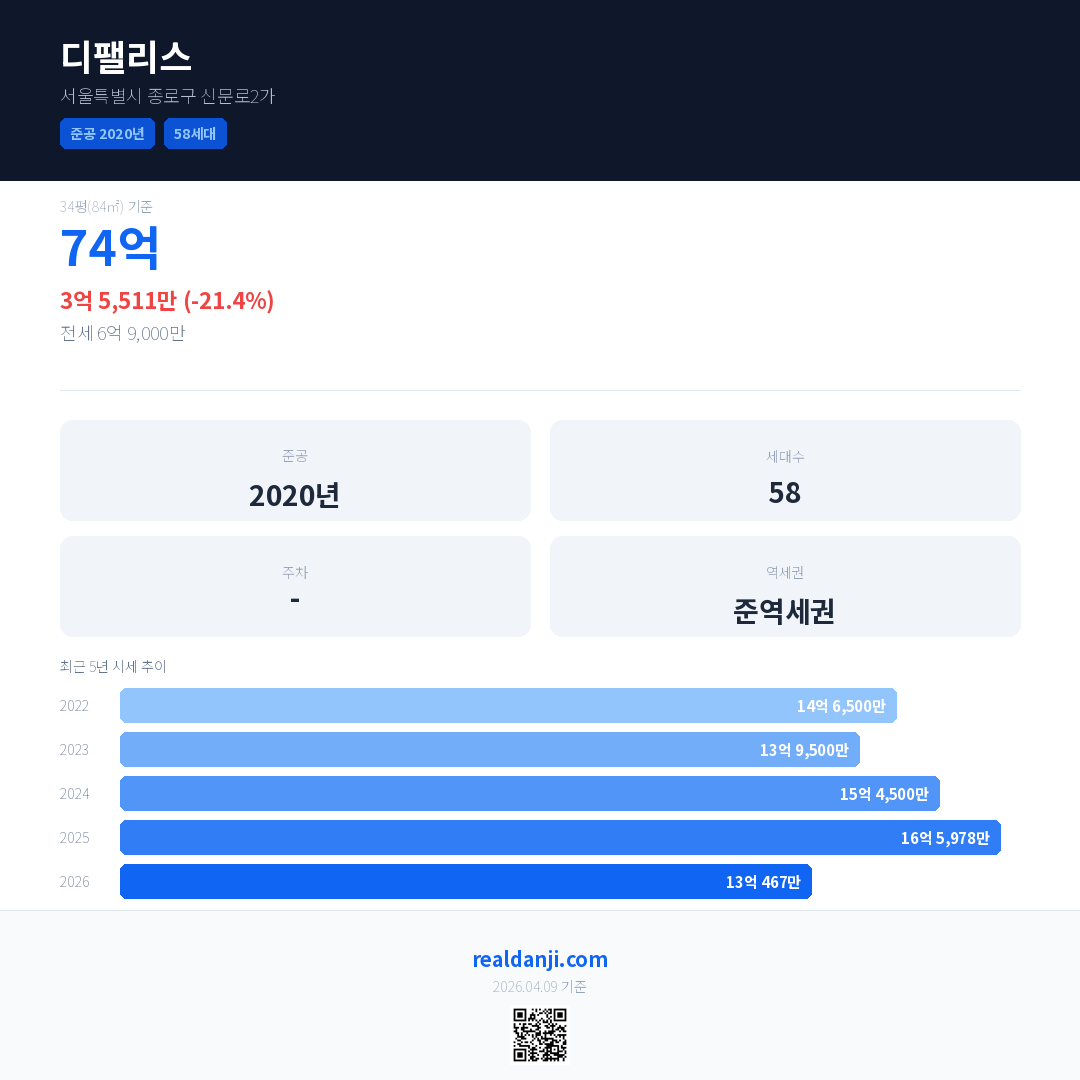 디팰리스 국민평형 기준 2026년 평균 거래가는 13억 467만으로, 전년 대비 21.4% 하락 했습니다.