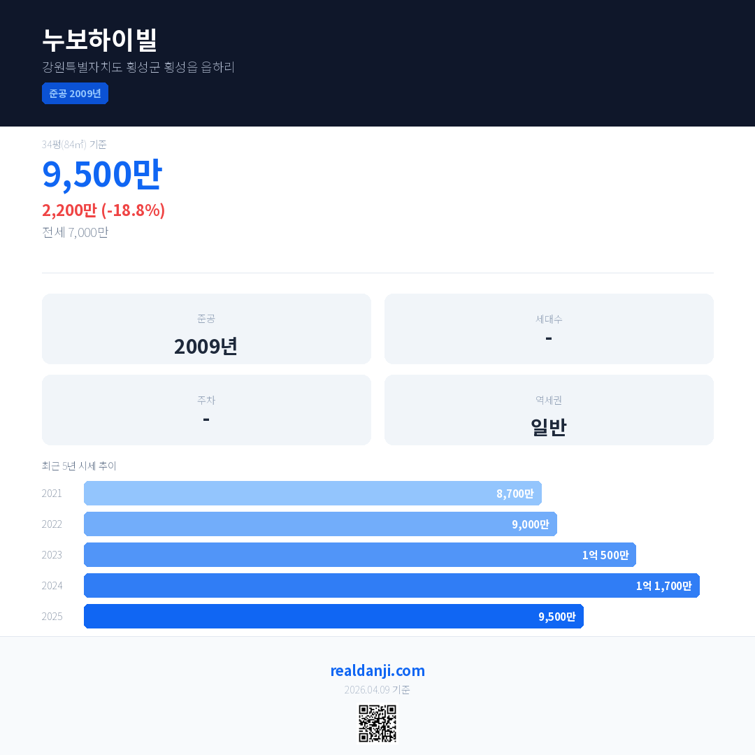 누보하이빌 국민평형 기준 2025년 평균 거래가는 9,500만으로, 전년 대비 18.8% 하락 했습니다.